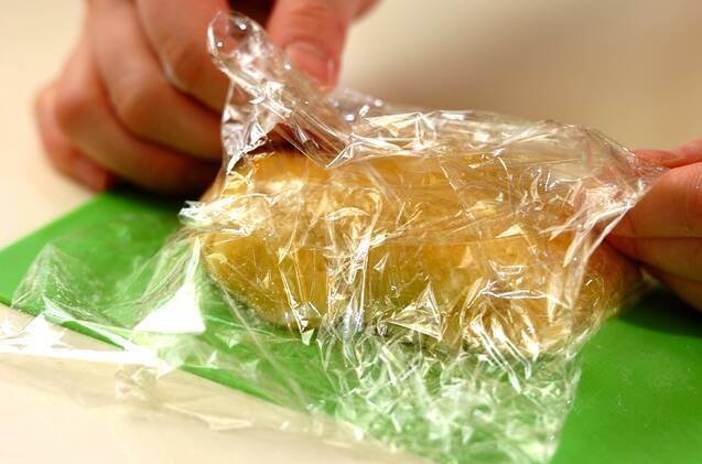 卵黄と水も加え30秒程かくはんし、まだ粉っぽさが残っている状態でラップに包み、冷蔵庫で最低1時間休ませる。
