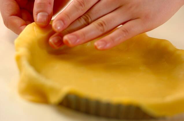 (2)の生地を手でまとめ粉っぽさがなくなったらラップではさみ直径21cmにのばし、タルト型に敷き底面にフォークで穴をあけ、冷蔵庫で20~30分休ませる。