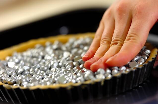 (3)の上に重しをのせ、170℃に予熱しておいたオーブンで10分焼いたら重しをはずし、さらに10~15分ほど焼き、ケーキクーラーにのせて冷ましておく。