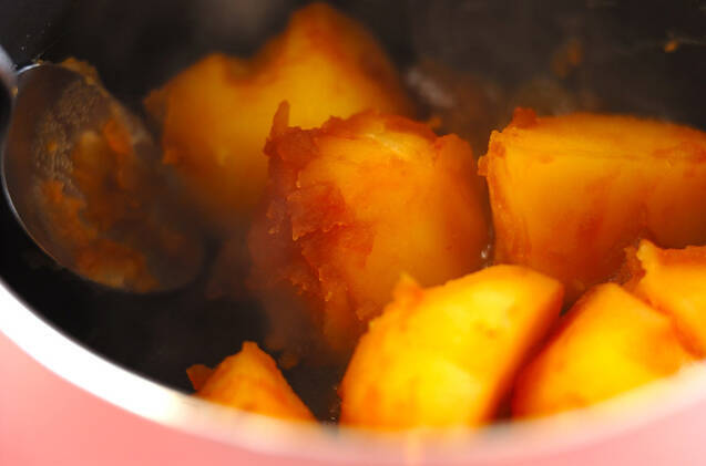 落とし蓋を取り、時々鍋をゆすりながら、煮汁をからめる様にして煮汁が少なくなるまで強火で煮詰める。器に盛り、ユズ皮をのせる。