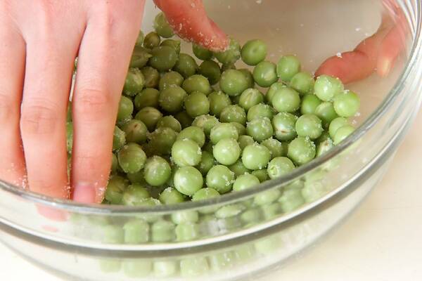 エンドウ豆はさやから出し、塩をまぶしつける。