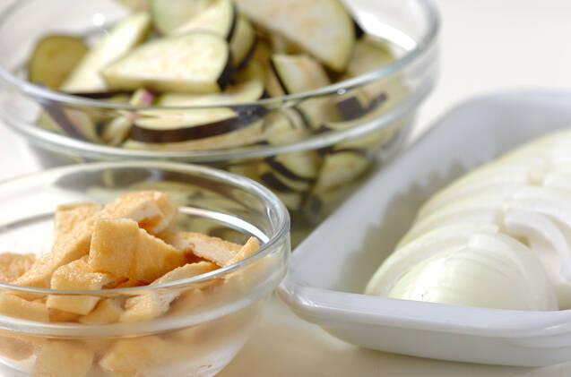 ナスはヘタを切り落とし、縦半分に切って半月切りにする。