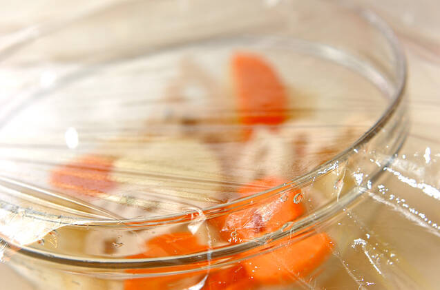 耐熱容器に(1)の野菜を入れ、ラップをかけて電子レンジで3~4分加熱し、混ぜ合わせてもう一度ラップをかけ2~3分加熱する。電子レンジは600Wを使用しています。