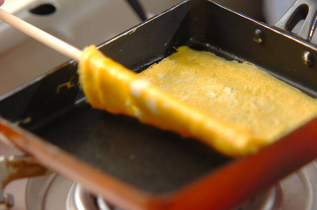 <薄焼き卵>の材料を混ぜ合わせる。卵焼き器に薄く分量外のサラダ油を熱し、卵液の半量を流し入れ、表面が乾いてきたら、菜ばしなどで裏返し、サッと焼いて器に取り出す。2枚作り、焼きのりの幅に合わせて端を切る。