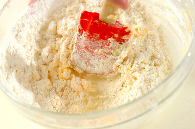 薄力粉を振るいながら加えてゴムベラで混ぜ合わせ、しっかり混ざったらラップに包んで冷蔵庫で休ませる。