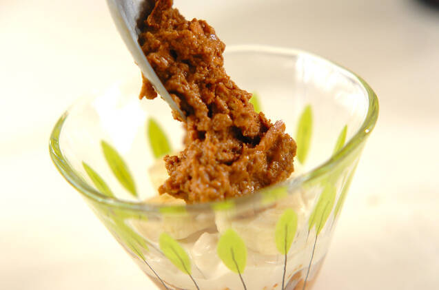 器にビスケットの1/4量をしき(入らない場合は砕いてOKです)、(2)の<豆腐クリーム>の1/4量を入れてバナナの半量をのせ、さらにビスケット、<豆腐クリーム>の順にのせる。もう一回同様に繰り返す。