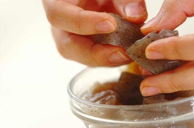 板コンニャクはひとくち大にちぎって水からゆで、煮たったらザルに上げる。