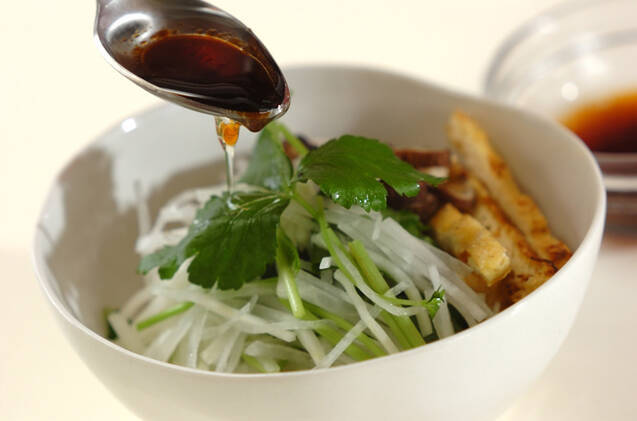 器に大根、ミツバ、油揚げ、シイタケを盛り合わせ、<ドレッシング>をかける。