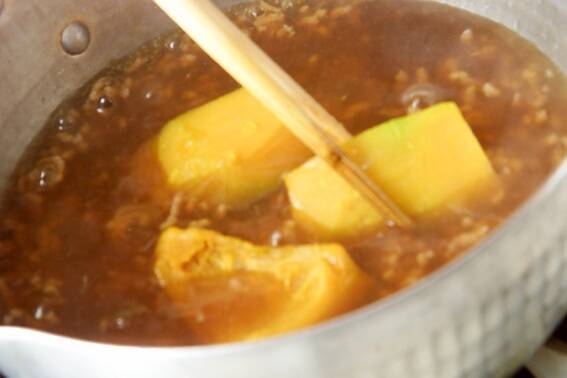 豚肉がポロポロになればアクを取り、<水溶き片栗>を混ぜながら加え、トロミがつけばカボチャを加え、軽く混ぜ合わせて火を止め、器に盛る。