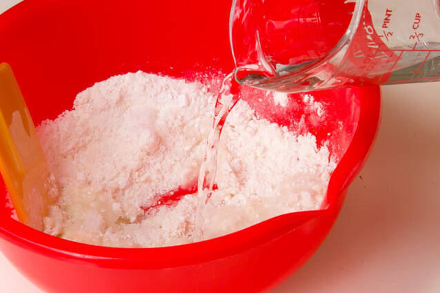 ボウルにくず粉、白玉粉、小麦粉、砂糖を合わせ、水100mlを2~3回に分けて加え、その都度よく混ぜ合わせる。網をとおしてダマをなくす。