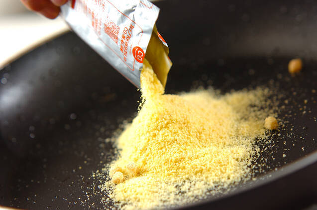 (2)のフライパンにコーンスープの素と牛乳を入れて火にかけ、トロミがついてきたら粉チーズを加えて混ぜ合わせる。(2)を戻し入れて混ぜ合わせ、塩コショウで味を調える。器に盛り、ドライパセリを振る。