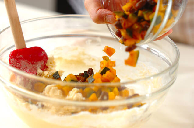 カボチャとレーズンを加え、全体を混ぜ合わせたら、マフィン型に入れる。