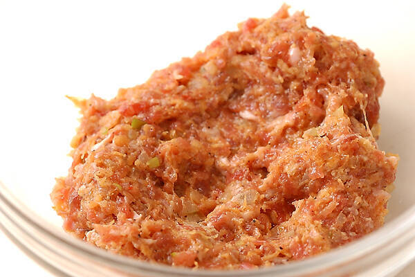みじん切り玉ネギは、フライパンにサラダ油少々を熱し、しんなりするまで炒め、粗熱が取れれば、ボウルに他の<ハンバーグ種>の材料と合わせ、よく粘りが出るまで手で混ぜ合わせる。 (肉が体温で温まらないうちに手早く、ただし肉の繊維が見えてくるくらいしっかりと練る)
