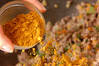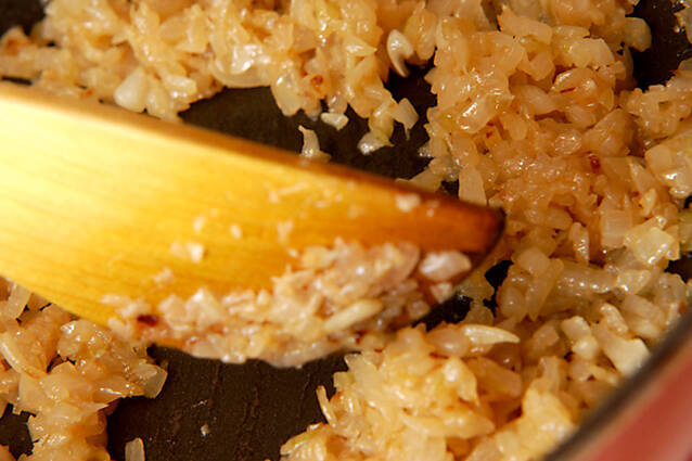 深めのフライパン、または中華鍋にバターを熱してニンニク、玉ネギを炒める。玉ネギに少し色がついてきたら、時々混ぜながら弱めの中火で10分位炒める。ニンジンを加えて炒め合わせ、ニンジンが全体に混ざったら、ピーマンを加えてさらに炒める。