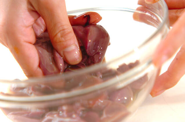 鶏レバーはひとくち大に切り、分量外の塩水に15分さらして血抜きをし、水気を拭く。<下味>の材料をからめ、10分おいて汁気をきり、小麦粉をまぶす。