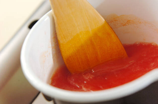 小鍋に水と粉寒天を入れて混ぜ合わせ、スイカも加えて強火にかける。混ぜながら煮たったら火を弱め、軽い沸騰状態で1~2分混ぜながら煮る。