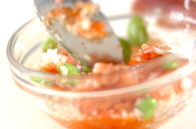 豆腐はサッと水洗いして6~9等分に切って器にのせる。<薬味・1 >の明太子は薄皮から中身をしごきだし、他の<薬味・1>の材料と混ぜ合わせる。