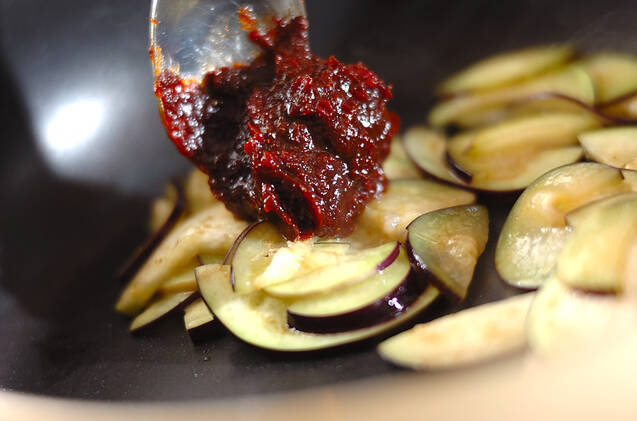 <薬味・2>のナスは薄い半月切りにする。赤みそ、砂糖、豆板醤を混ぜ合わせる。フライパンにゴマ油を熱してナスを炒め、合わせた赤みそを加え、全体にからまったら白ゴマを混ぜる。