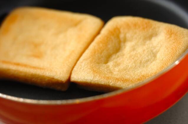 フライパンを中火で熱し、油揚げを並べ入れ、両面にこんがりと焼き目を付けて、細切りにする。
