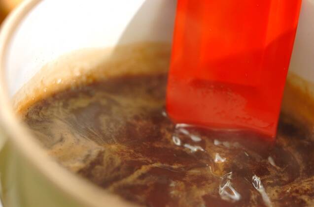 <黒蜜>を作る。鍋に<黒蜜>のすべての材料を入れ、中火で煮る。黒糖ときび砂糖が溶けたら、弱火で約8分煮る。出来上がりを冷蔵庫で冷やす。