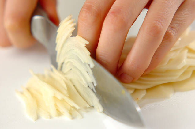 ジャガイモは皮をむいてスライサーで薄切りにし、さらにせん切りにして水に放ち、ザルに上げる。