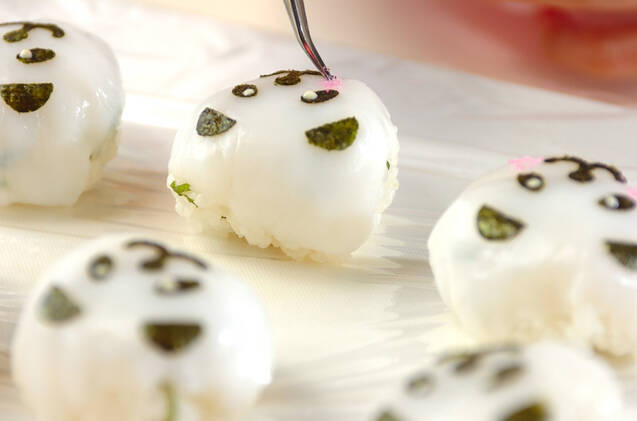 焼きのりで目、耳と鼻、口に見立ててのせる(8個作る)。目はマヨネーズを絞り出し、桜でんぶは頬にのせる。