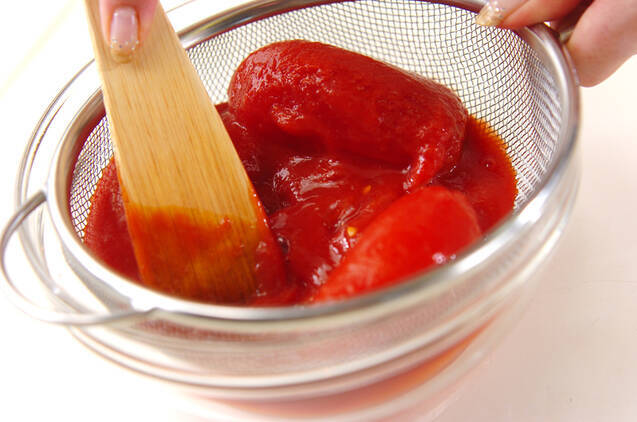 ベーコンは幅1cmに切る。赤唐辛子は半分に割る。辛いのがお好みの方は、赤唐辛子の種も加えて下さい。水煮トマトは網を通す。塩大さじ1を加えたたっぷりの熱湯を準備し始める。