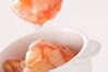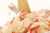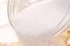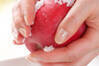 縦6~8つに切り、芯を取って薄いイチョウ切りにし、耐熱容器に入れグラニュー糖、レモン汁を掛けて電子レンジで約3分加熱してグラニュー糖を溶かす。リンゴの量を計ってグラニュー糖の量を決めて下さい。ここで使っているレンジは600wです。500wの場合は加熱時間を1.2倍にして下さい。