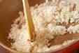 鍋又は深めのフライパンにバターを熱し、玉ネギ、ベーコンを加えて炒める。玉ネギが透き通ってくれば、米を加えて炒め合わせる。
