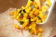 米が半透明になれば、白ワインを注ぎ、強火で水気を飛ばすように手早く炒め、カボチャを加えて更に炒め合わせる。