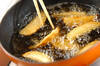 常温の揚げ油をヒタヒタになるまで注ぎ入れ、中火にかける。ジャガイモに竹串が通るようになったら強火にして揚げ色をつけ、取り出して油をきる。