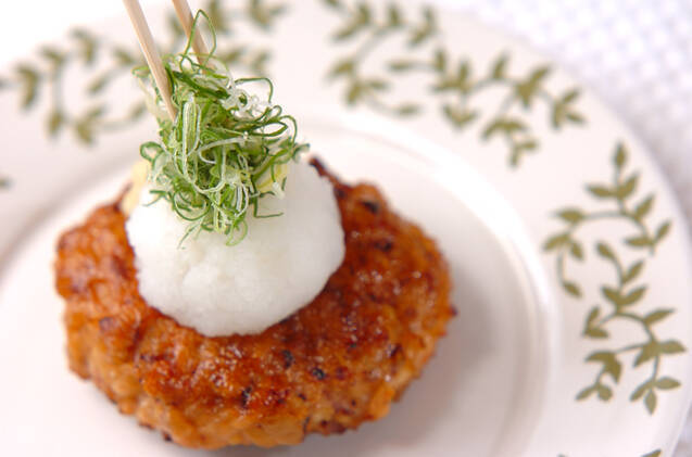 ハンバーグの上に大根おろし、おろしショウガ、刻みネギをのせ、(4)の<和風ダレ>を掛ける。最後に刻みのりをのせ、トマトを添える。