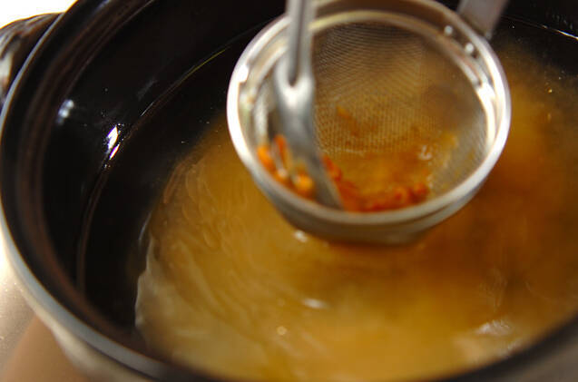 土鍋に<スープ>の材料を入れて火にかけ、煮たったらみそを溶き入れる。