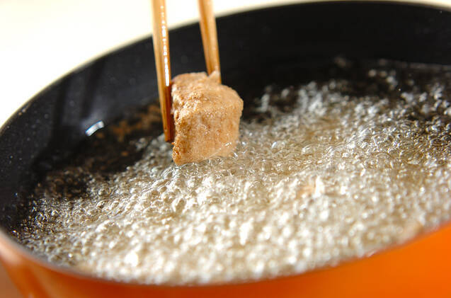 (1)のカツオに片栗粉をまぶし、170℃の揚げ油でカラッと揚げる。