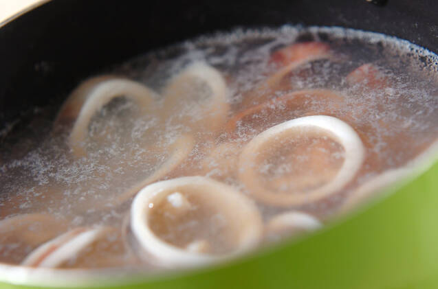 たっぷりの熱湯に<下処理>の白ワインと塩を入れてイカを加え、白っぽくなったらすぐに引き上げ冷ましておく。