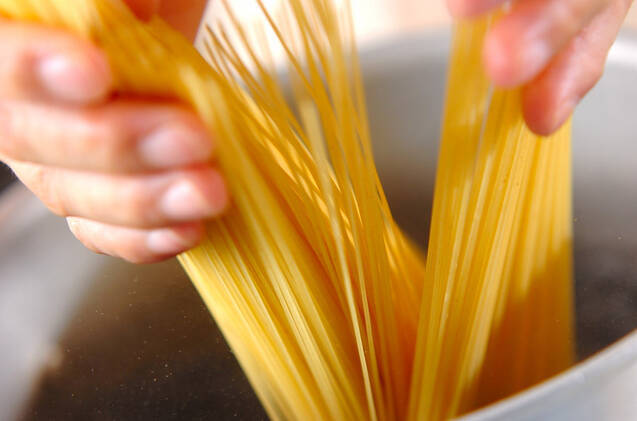 たっぷりの熱湯にゆでる用の塩を入れて、スパゲティを入れ、沸騰状態を保ちながら、くっつかない様に時々混ぜて、表示時間より1分長くゆでる(ここでは2分ゆでを使っていますのでゆで時間は3分間です)。ゆであがる30秒前にグリーンアスパラを加える。