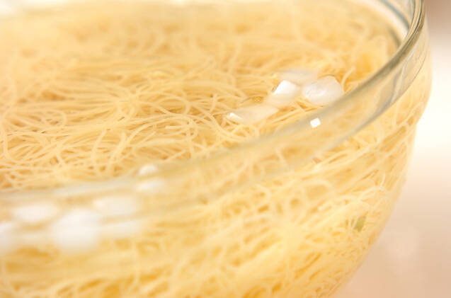 ゆで上がったら、ザルに上げて流水で手早く洗って氷水に放つ。全体に混ぜながらパスタを冷やし、ザルに上げてしっかり水気をきる。