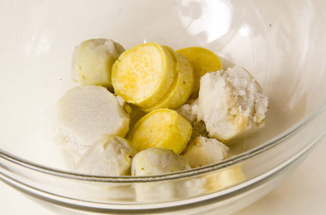 里芋は皮ごとたわしで水洗いし、上下を切り落として水に放ち、サツマイモは皮ごときれいに水洗いし、1cm幅の輪切りにし塩水に放つ。耐熱容器にぬれたままの里芋、サツマイモを並べ、ふんわりラップをかけ電子レンジで5分加熱し、向きを変えて更に4~5分加熱する。竹串がス~ッと刺さればOKです。タオル等で包んで、皮をむき、ボウルに入れる。
