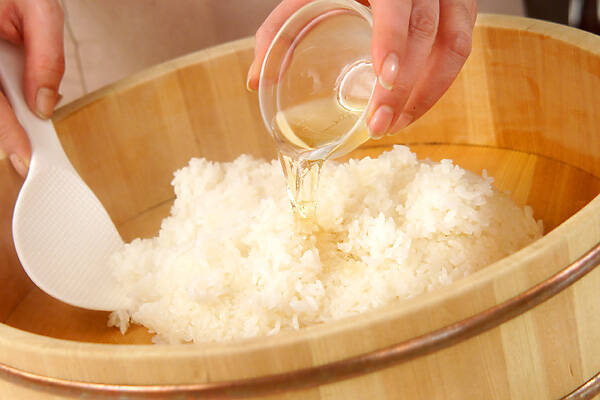 米は水洗いして30分以上置き、炊飯器に入れ、昆布、酒を加えすし飯の水加減をして、スイッチを入れる。炊きあがれば飯台に開け、作り置き甘酢をかけ、1分そのまま蒸らす。しゃもじで切るように混ぜ合わせ、人肌位まで冷ます。