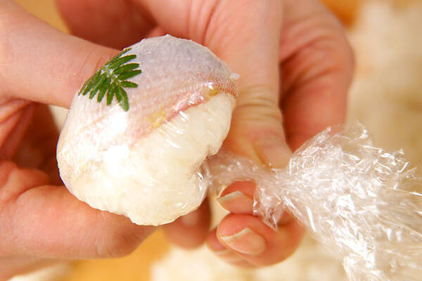 1のすし飯を16等分に分け、ラップに木の芽+小鯛+すし飯をのせラップごと丸く形を整える。
