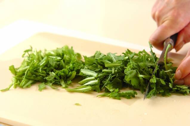 春菊(菊菜)は洗い、水気をきる。茎は1cm程度に小さく切り、葉の部分はザク切りにする。