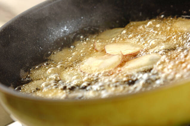 揚げ油にサツマイモを入れ、浮いてくるまで揚げて油をきり、いったん取り出す。