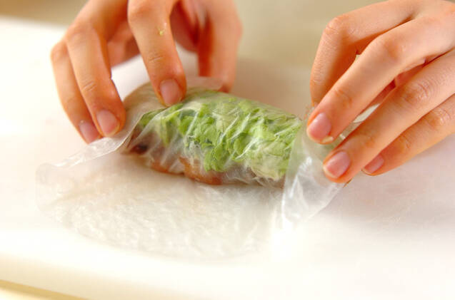 ライスペーパーの両面に霧吹きで水を吹き、平らな所に広げる。レタス、大葉、マヨネーズ、(2)をのせ、手前からライスペーパーの端をかぶせ、左右を内側に折り、しっかり巻き込む。食べる直前に食べやすい大きさに切って、トマトと一緒に盛る。
