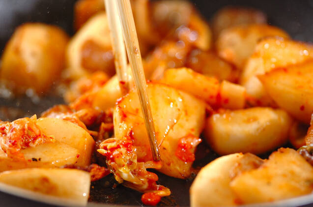 白菜キムチを加えて汁気を飛ばすように炒め、器に盛る。