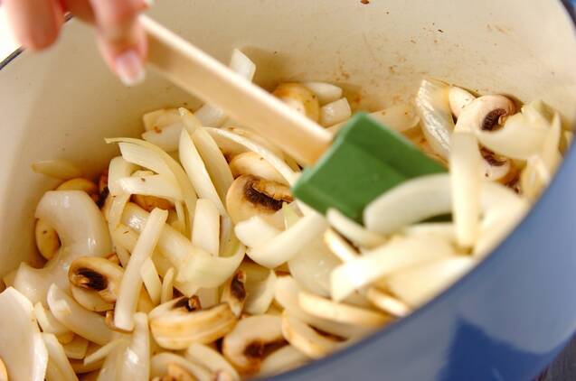 (1)の鍋に残りのバター15gを熱して玉ネギを炒め、しんなりしたらマッシュルームを加えてさらに炒める。
