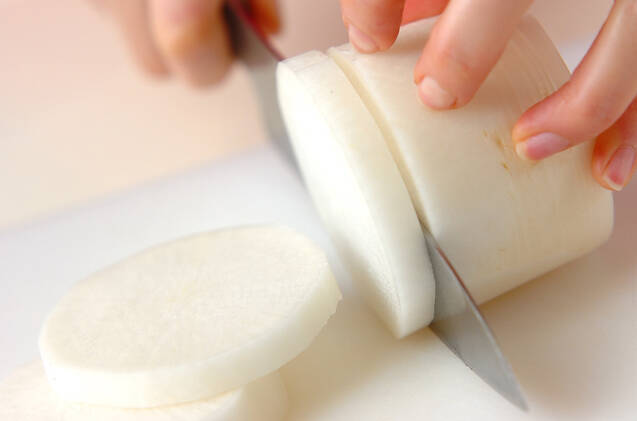 大根は皮をむき、厚さ1cmの輪切りにする。