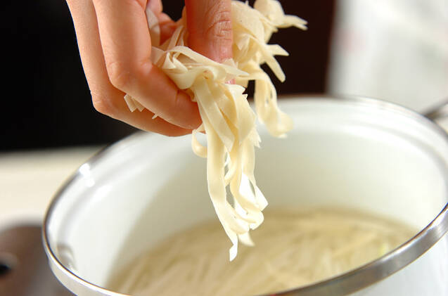 鍋に<スープ>の材料を入れ、よく混ぜ合わせながら中火にかける。中華スープの素が溶けたら白ネギ、餃子の皮を加え、1~2分煮る。