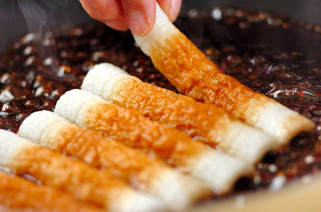 フッ素樹脂加工のフライパンに<調味料>の材料を入れ、強火にかける。焦げないようによく混ぜ、沸騰したら弱火にしてちくわをからめる。