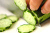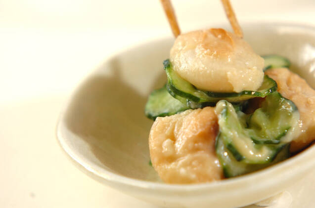 食べる直前に<からし酢みそ>のボウルにもち麩、キュウリを加えて和え、器に盛る。