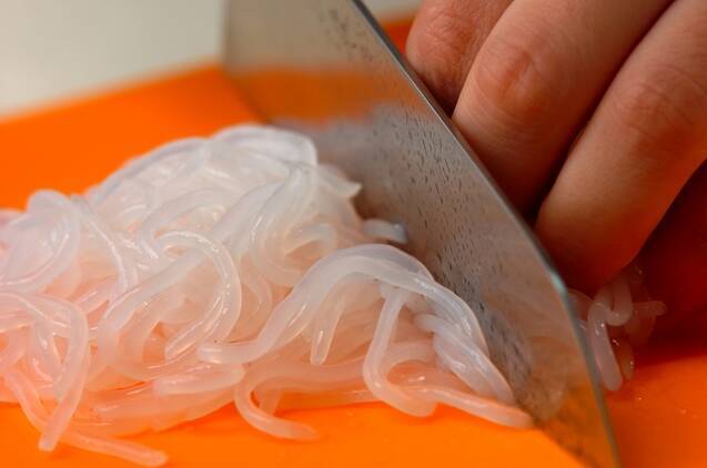 しらたきはサッと水洗いし、食べやすい長さに切ってザルに上げる。
